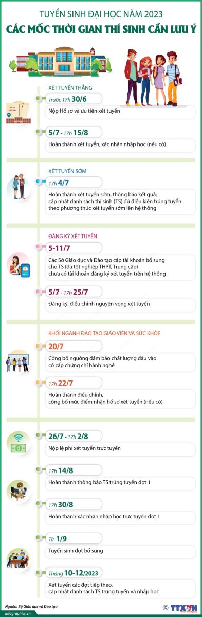 Các mốc thời gian thí sinh cần lưu ý trong tuyển sinh đại học năm 2023 03/04/2023 03:15 3489 lượt xem Tại Hội nghị tuyển sinh năm 2023 diễn ra ngày 3/3/2023, Bộ Giáo dục và Đào tạo đã thông tin dự thảo Kế hoạch tuyển sinh năm 2023, với một số mốc thời gian thí sinh cần lưu ý.