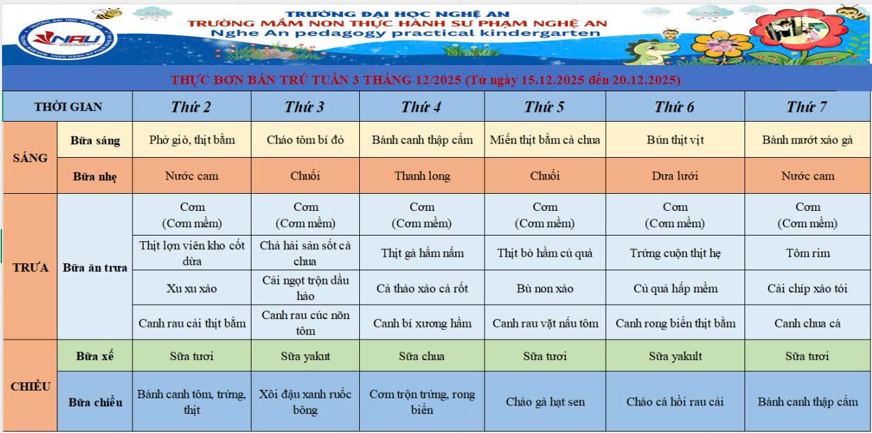 Một tuần mới lại bắt đầu với thực đơn bán trú giàu dinh dưỡng, được xây dựng khoa học, cân đối các nhóm chất, đảm bảo cung cấp đủ năng lượng và vi chất cần thiết cho trẻ tham gia các hoạt động học tập – vui chơi mỗi ngày.