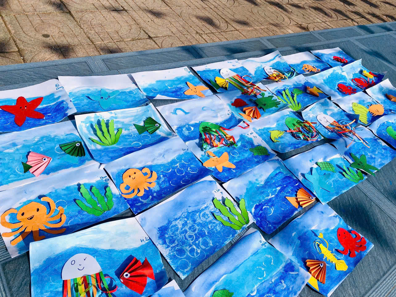 Nổi bật trong đó là hoạt động liên khối “Sắc màu Đại dương” – nơi trẻ được học bằng tất cả sự hứng thú và say mê. Mỗi bức tranh về động vật sống dưới biển của bé là một mảnh ghép nhỏ xinh, mang đậm dấu ấn cá nhân. Trẻ được tự tay quét nền xanh thẳm của đại dương, tự do lựa chọn màu sắc, chất liệu, tạo hình cá, tôm, sao biển… theo trí tưởng tượng phong phú của mình.