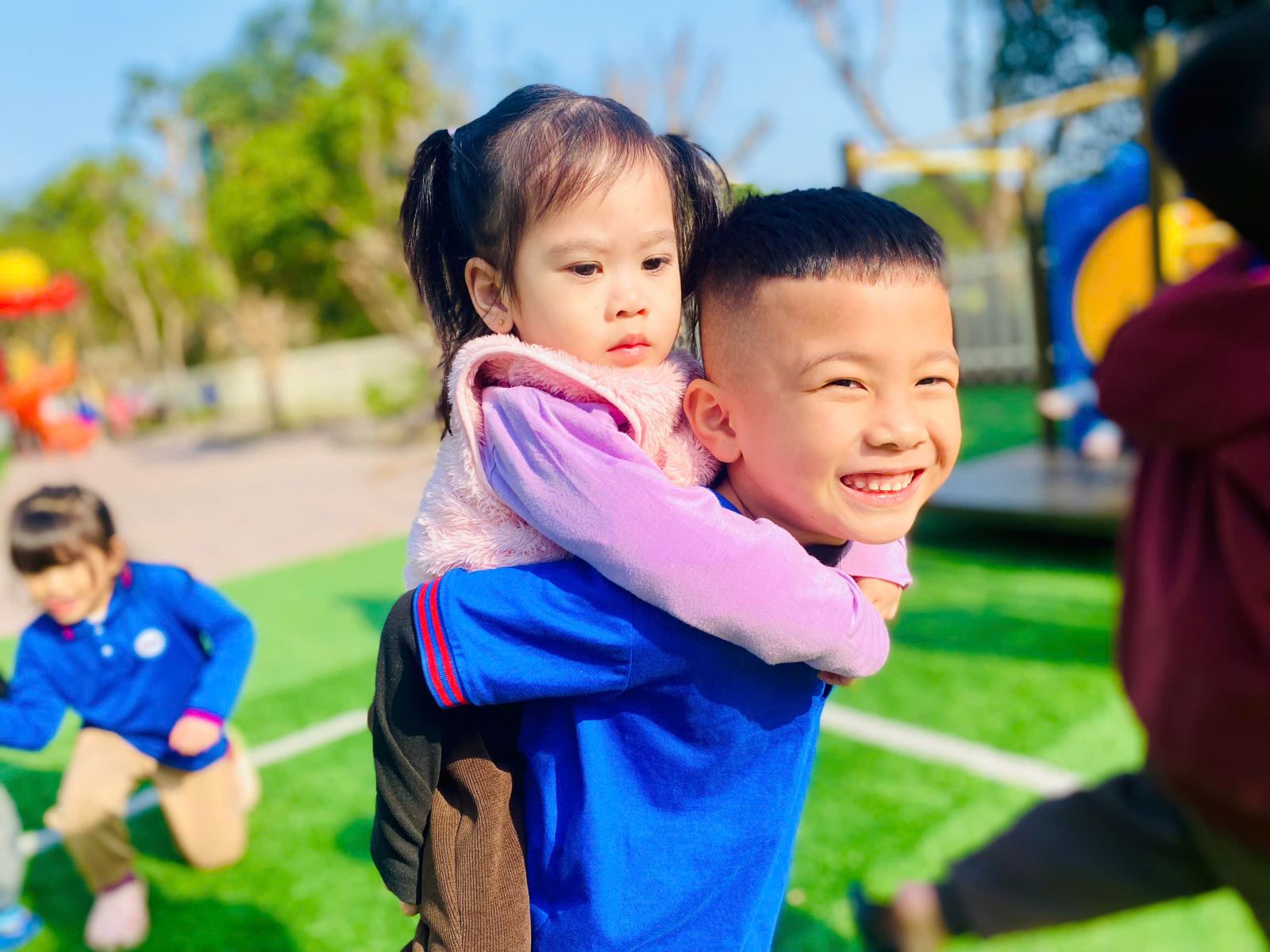 Với mong muốn mang đến cho trẻ nhiều cơ hội được giao lưu, kết nối và sẻ chia, nhà trường chú trọng tổ chức các hoạt động gắn kết giữa các nhóm lớp và các độ tuổi khác nhau. Ở đó, những nụ cười rạng rỡ, ánh mắt háo hức và tiếng cười trong trẻo vang lên khi các bé cùng nhau tham gia hoạt động, cùng phối hợp, hỗ trợ và học hỏi lẫn nhau. Không gian lớp học và sân chơi trở thành nơi chan chứa sự thân thiện, ấm áp – nơi mỗi trẻ đều cảm nhận được niềm vui khi được là một phần của tập thể.