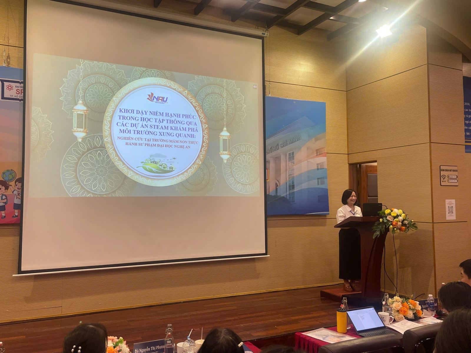 Đóng góp nổi bật tại hội thảo, Thạc sĩ Nguyễn Thị Sương Lan – đại diện đoàn công tác Trường Đại học Nghệ An – đã trình bày báo cáo khoa học với chủ đề: “Khơi dậy niềm hạnh phúc trong học tập thông qua các dự án STEAM khám phá môi trường xung quanh – Nghiên cứu tại Trường Mầm non Thực hành Sư phạm Đại học Nghệ An”.