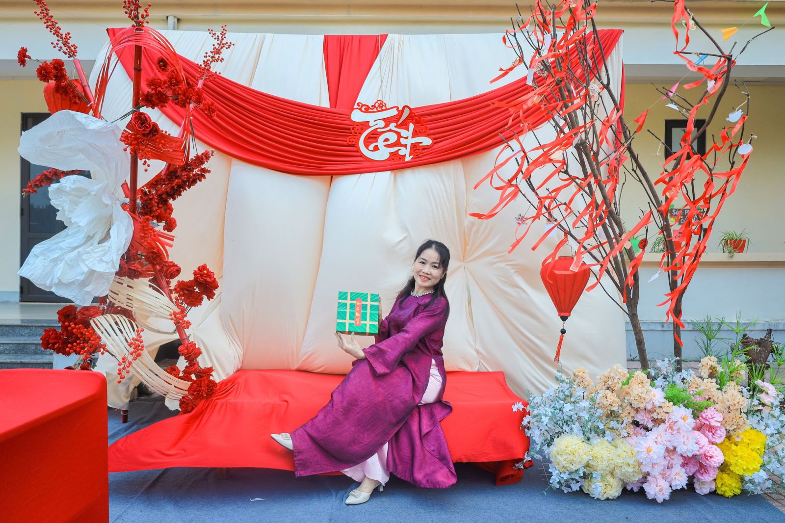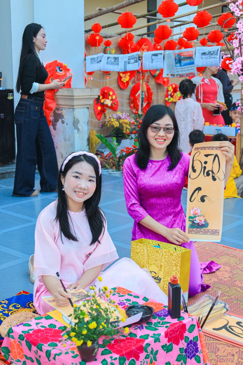 Ngay từ những khoảnh khắc đầu tiên, khuôn viên nhà trường đã khoác lên mình sắc xuân tươi mới với hoa đào, hoa mai, câu đối đỏ, gian hàng Tết truyền thống… Tất cả hòa quyện tạo nên một không gian Tết thân quen, gần gũi và đầy ắp niềm vui.