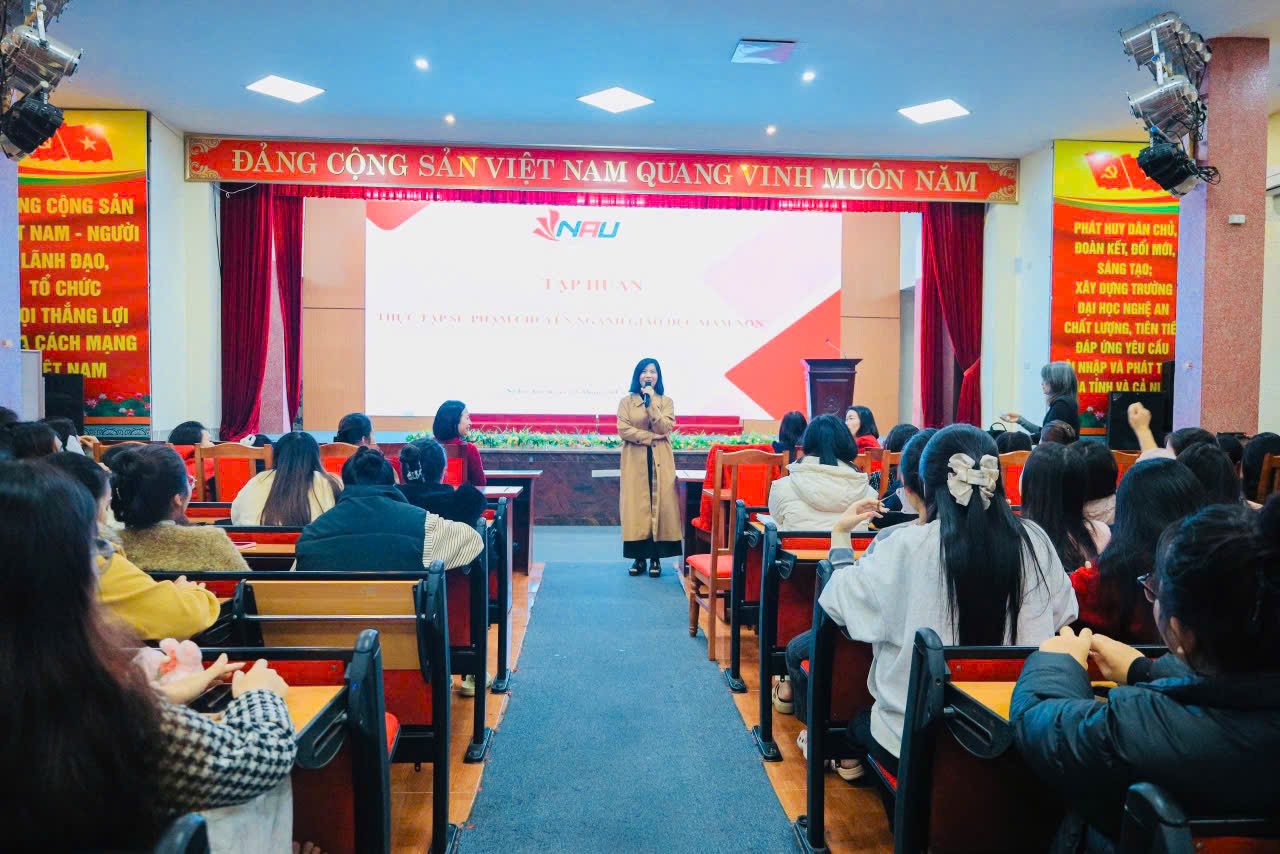 Nhằm chuẩn bị tốt nhất về chuyên môn, kỹ năng nghề nghiệp và tác phong sư phạm cho sinh viên trước khi bước vào đợt thực tập sư phạm tại các trường mầm non, Khoa Mầm non – Trường Đại học Nghệ An đã phối hợp với trường Mầm non Thực hành Sư phạm tổ chức buổi tập huấn thực tập sư phạm dành cho sinh viên các khóa K45 và K46 Cao đẳng Mầm non.