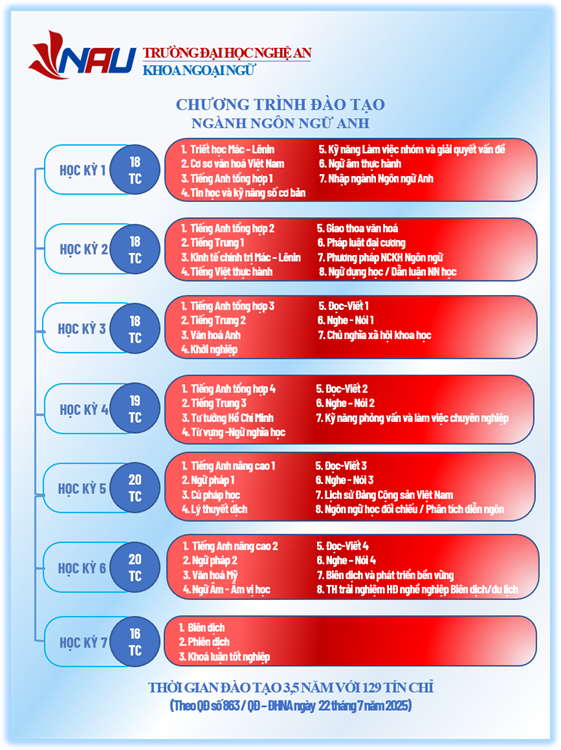 Đáp ứng sự tăng trưởng vượt bậc cả về quy mô và chất lượng của Nhà trường, trong thời gian tới, Chương trình đào tạo của Ngành Ngôn ngữ Anh sẽ tiếp tục cải tiến để đáp ứng yêu cầu của xã hội ngày càng cao trong đào tạo nguồn nhân lực trên địa bàn tình và khu vực Bắc Trung Bộ.