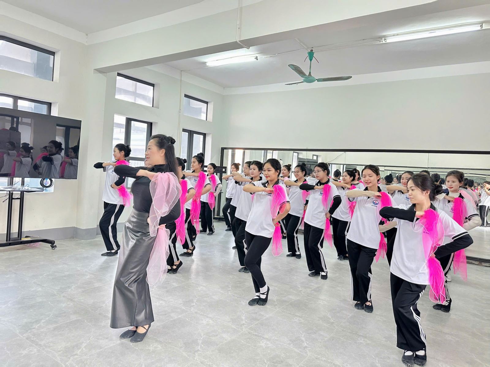 Hình ảnh ghi nhận tại giờ học đầu tuần của tập thể K46 cho thấy tinh thần học tập nghiêm túc và say mê. Những dải lụa hồng bay bổng trong không gian gương soi hiện đại không chỉ tạo nên một bức tranh đẹp, mà còn minh chứng cho sự nỗ lực không ngừng của các em trong việc hoàn thiện kỹ năng nghề nghiệp.