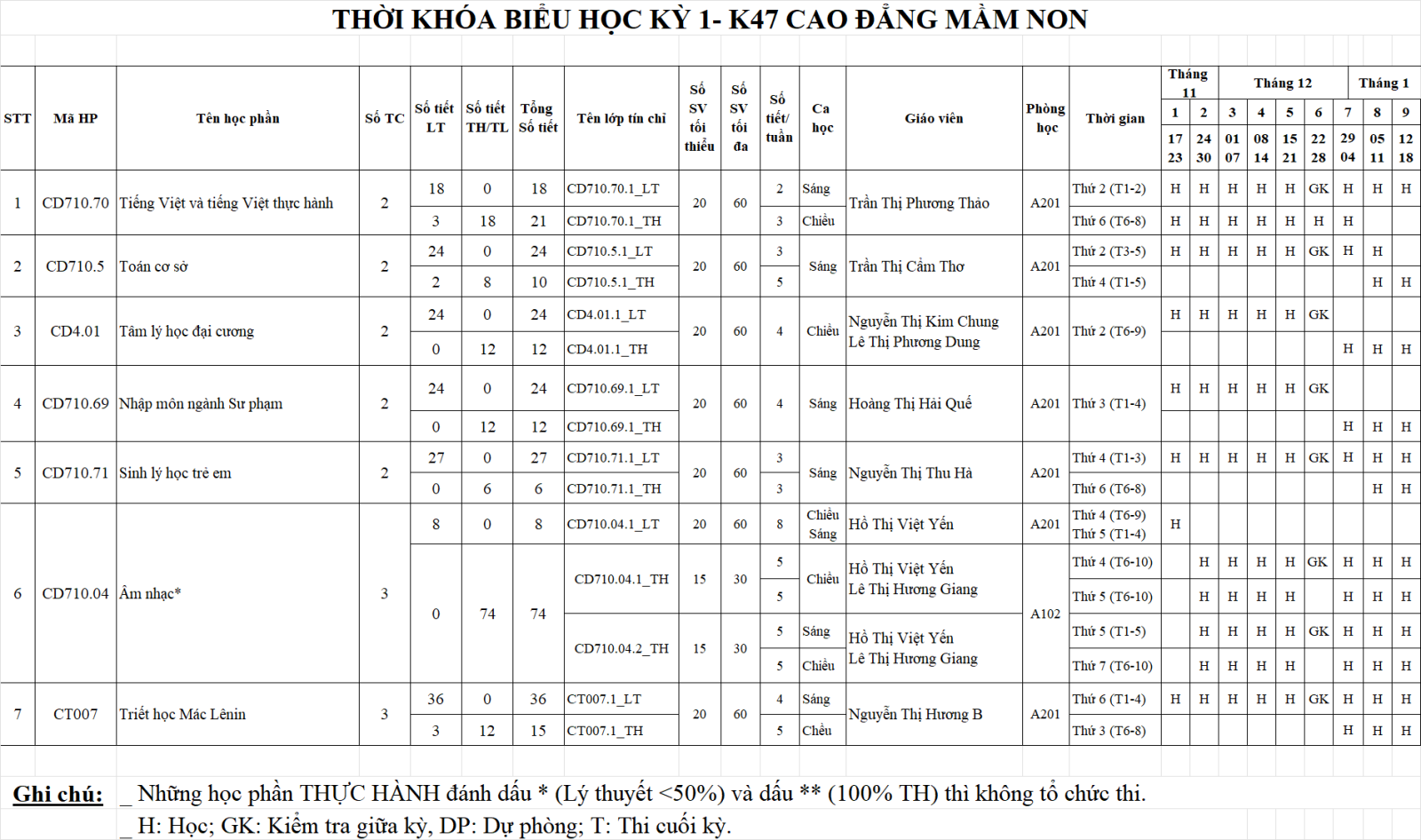 THỜI KHÓA BIỂU K47 CAO ĐẲNG MẦM 03/12/2025 12:30 235 lượt xem GIAO KẾ HOẠCH HỌC KỲ 1 NĂM HỌC 2025 - 2026 K47 MẦM NON - HỆ CAO ĐẲNG CHÍNH QUY TT MÃ HP HỌC PHẦN SỐ TC SỐ TIẾT SỐ SV Số SV* Số lớp I. KHOA HỌC CƠ BẢN 1 CT007 Triết học Mác Lênin 3 39+12 34 34*1 2 CD710.04 Âm nhạc* (Lý thuyết) 3 8 34 34*1 Âm nhạc* (Thực hành) 74 34 17*2 II. KHOA GIÁO DỤC 1 CD710.5 Toán cơ sở 2 26+8 34 34*1 III. KHOA GIÁO DỤC MẦM NON 1 CD710.69 Nhập môn ngành Sư phạm 2 24+12 34 34*1 2 CD4.01 Tâm lý học đại cương 2 24+12 34 34*1 3 CD710.70 Tiếng Việt và tiếng Việt thực hành 2 21+18 34 34*1 4 CD710.71 Sinh lý học trẻ em 2 27+6 34 34*1 Tổng: Ghi chú: Những học phần THỰC HÀNH đánh dấu *(Lý thuyết <50%) và dấu **(100%TH) thì không tổ chức thi