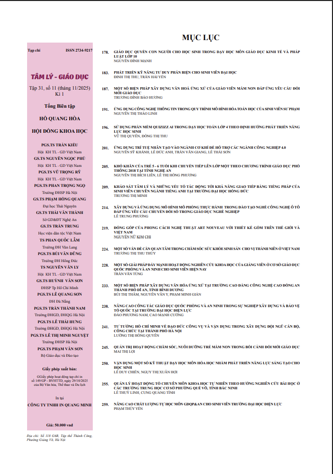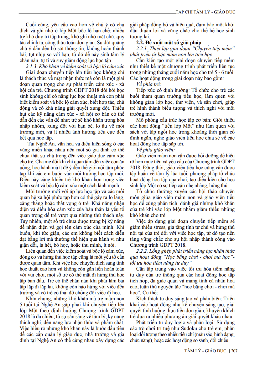 Bài viết: KHÓ KHĂN CỦA TRẺ 5 - 6 TUỔI KHI CHUYỂN TIẾP LÊN LỚP MỘT THEO CHƯƠNG TRÌNH GIÁO DỤC PHỔ THÔNG 2018 TẠI TỈNH NGHỆ AN 31/03/2026 03:54 139 lượt xem MỤC LỤC tập 31 số 11 kì 1 TV BÀI VIẾT: KHÓ KHĂN CỦA TRẺ 5 - 6 TUỔI KHI CHUYỂN TIẾP LÊN LỚP MỘT THEO CHƯƠNG TRÌNH GIÁO DỤC PHỔ THÔNG 2018 TẠI TỈNH NGHỆ AN