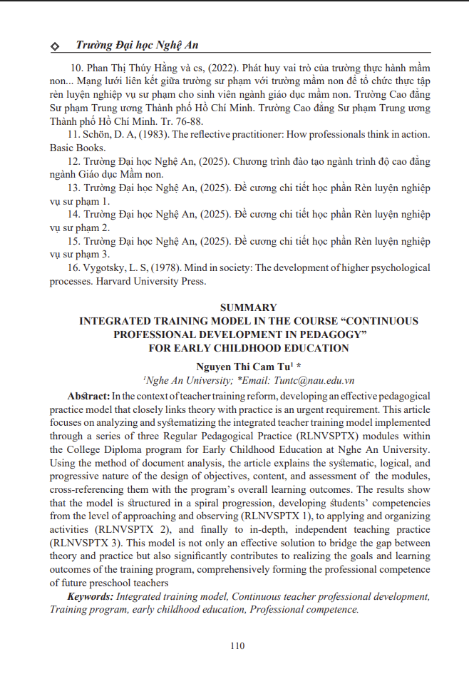MÔ HÌNH RÈN LUYỆN TÍCH HỢP TRONG CHUỖI HỌC PHẦN “RÈN LUYỆN NGHIỆP VỤ SƯ PHẠM THƯỜNG XUYÊN” NGÀNH GIÁO DỤC MẦM NON 10/02/2026 08:52 136 lượt xem