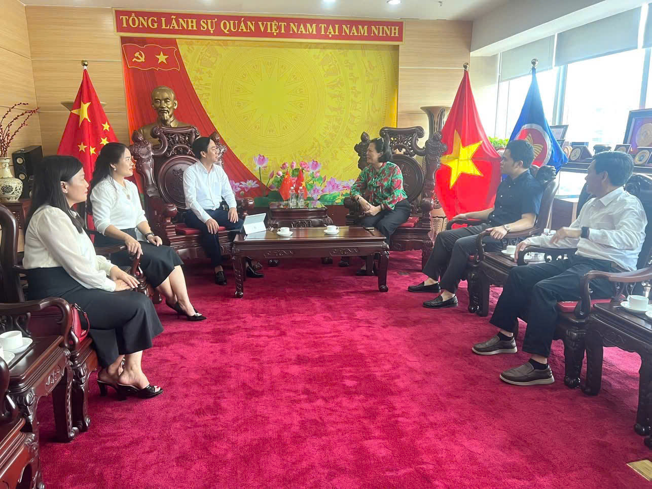 Trong khuôn khổ chuyến công tác tại Trung Quốc, đoàn công tác đã có buổi gặp gỡ và làm việc với bà Nguyễn Thị Hương - Tổng lãnh sự, cùng cán bộ lãnh sự quán Việt Nam tại thành phố Nam Ninh (Trung Quốc). Buổi làm việc diễn ra trong không khí cởi mở, thân thiện, thể hiện sự quan tâm và đồng hành của cơ quan đại diện ngoại giao Việt Nam tại Trung Quốc với hoạt động hợp tác quốc tế của các cơ sở giáo dục đại học trong nước.