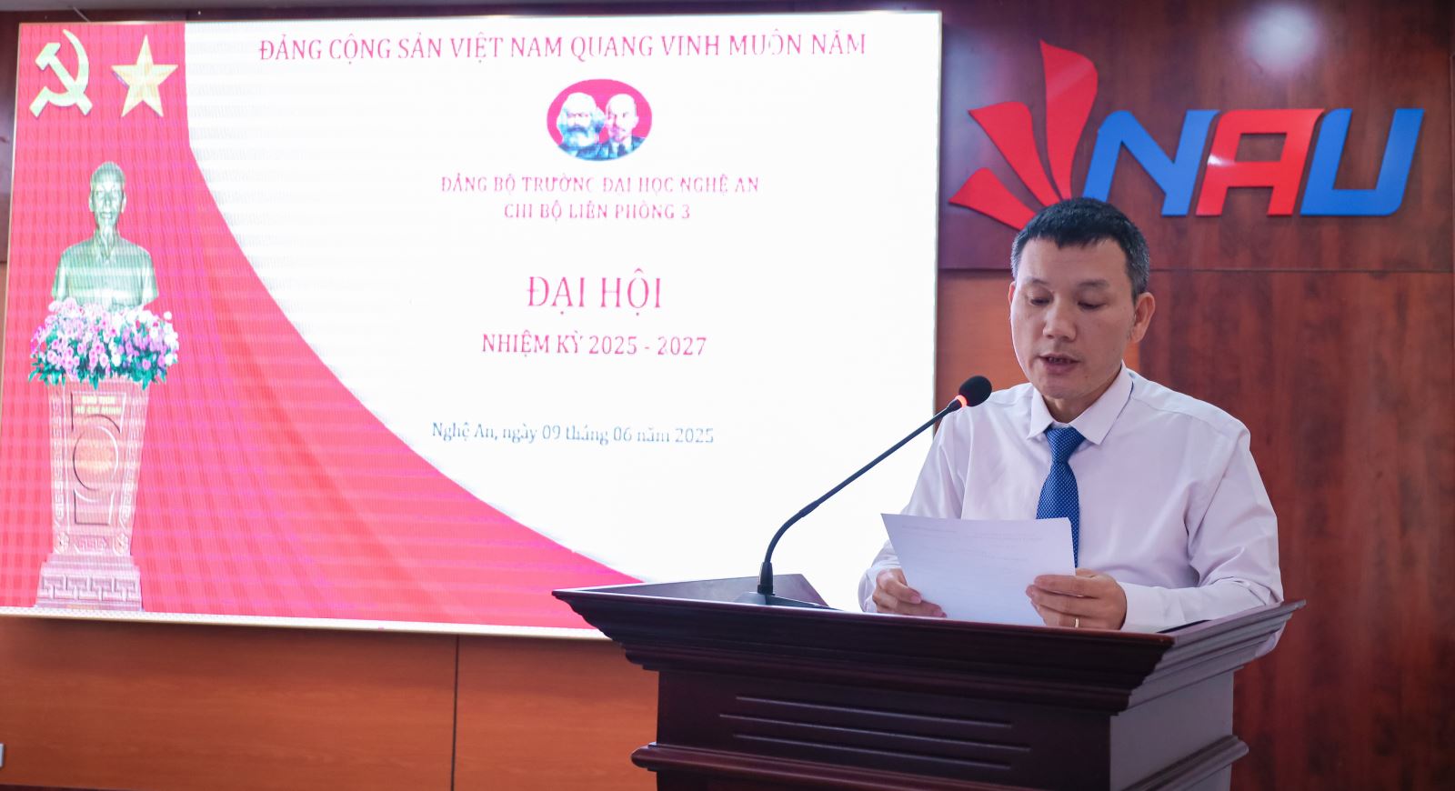 Nghị quyết Đại hội kêu gọi toàn thể cán bộ, đảng viên, viên chức và người lao động tiếp tục phát huy truyền thống đoàn kết, nâng cao tinh thần trách nhiệm, chủ động đổi mới, sáng tạo, quyết tâm thực hiện thắng lợi Nghị quyết Đại hội Chi bộ liên phòng 3 nhiệm kỳ 2025–2027, góp phần đưa Trường Đại học Nghệ An phát triển hiện đại, bền vững trong giai đoạn hội nhập mới.