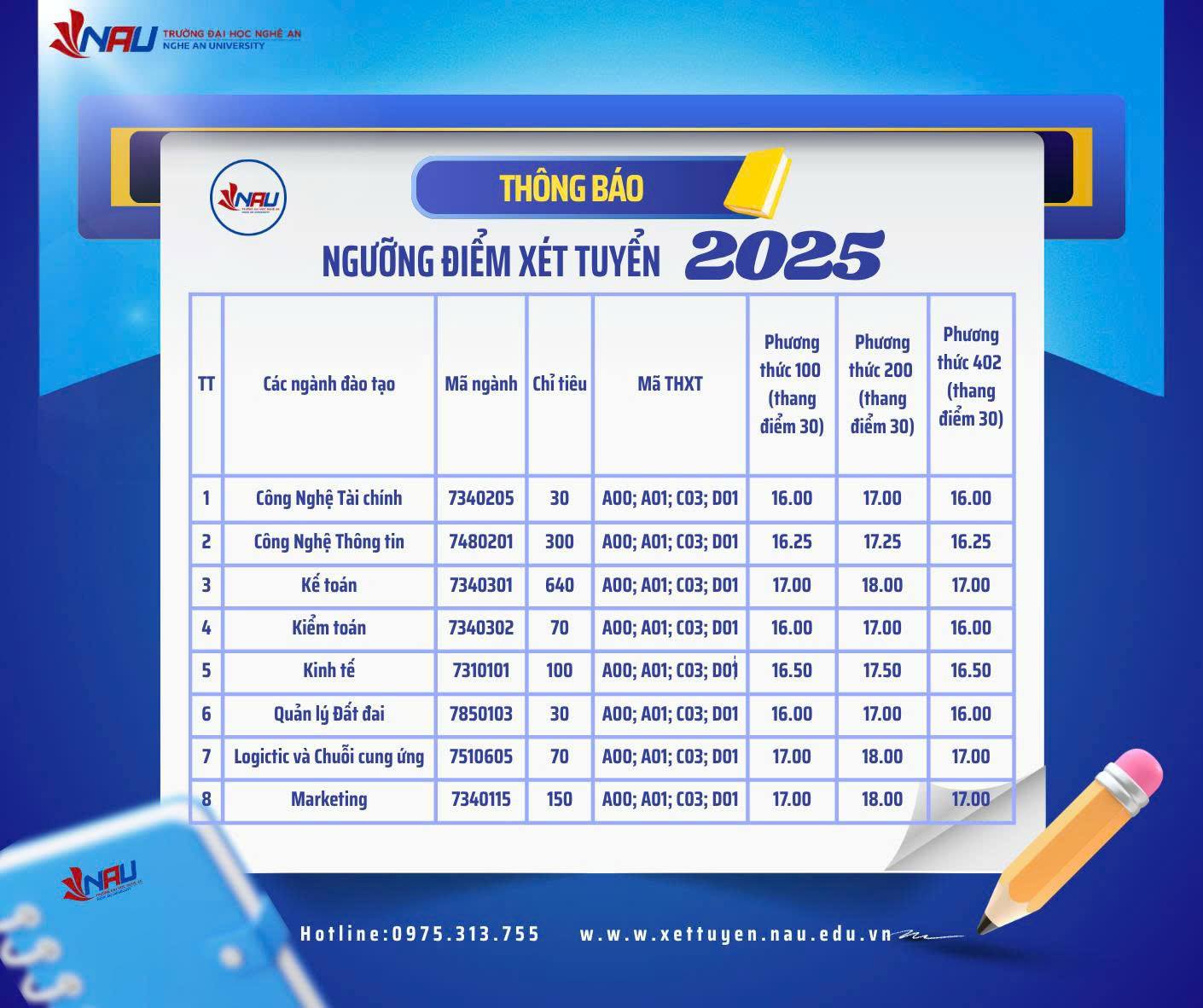 Trường Đại học Nghệ An thông báo ngưỡng điểm xét tuyển đầu vào đối với các phương thức xét tuyển hệ Đại học chính quy đợt 1 - Năm 2025