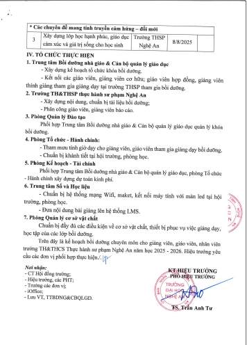 Kê hoạch bồi dưỡng chuyên môn cho Giảng viên, giáo viên tại trường TH&THCS THSP Nghệ An năm học 2025-2026 20/08/2025 09:26 1770 lượt xem