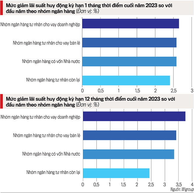 Năm 2023, tăng trưởng kinh tế và tăng trưởng tín dụng thấp dẫn đến các ngân hàng dư thừa thanh khoản, từ đó giảm áp lực trong việc huy động vốn.