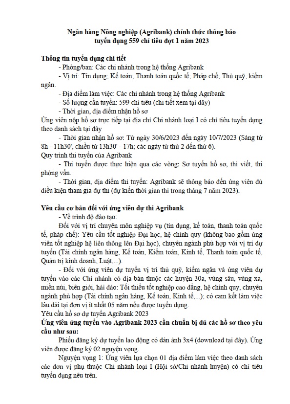 Ngân hàng Nông nghiệp (Agribank) chính thức thông báo tuyển dụng 559 chỉ tiêu đợt 1 năm 2023 27/07/2023 09:33 4645 lượt xem