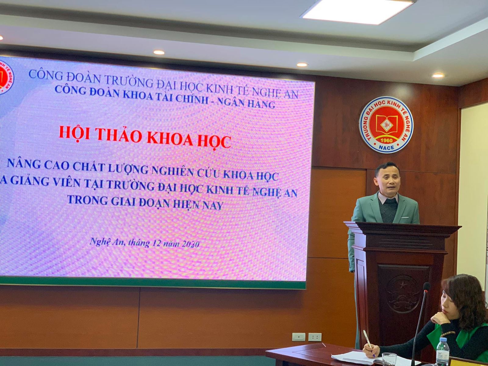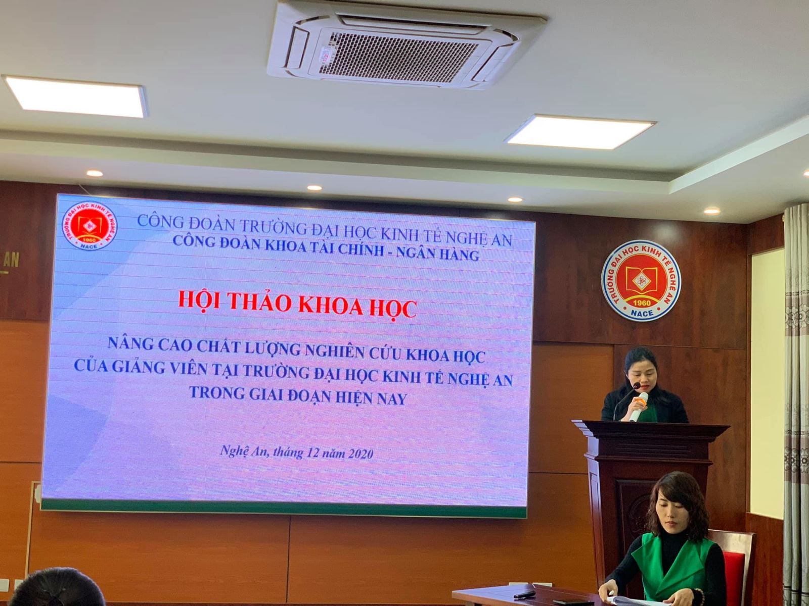 Thực hiện kế hoạch hoạt động năm học 2020 – 2021, kế hoạch của Công đoàn trường về việc phát động phong trào thi đua lập thành tích chào mừng kỷ niệm 60 năm Truyền thống Trường Đại học Kinh tế Nghệ An (1960 - 2020); Chào mừng Đại hội Đảng các cấp, tiến tới Đại hội XIII của Đảng. Được sự nhất trí của BGH nhà trường, sự phối hợp của các đơn vị phòng, khoa; sáng ngày 7/12/2020 Khoa Tài chính – Ngân hàng đã tổ chức Hội thảo cấp Khoa với chủ đề: “Nâng cao chất lượng nghiên cứu khoa học của giảng viên tại trường Đại học Kinh tế Nghệ An trong giai đoạn hiện nay”.