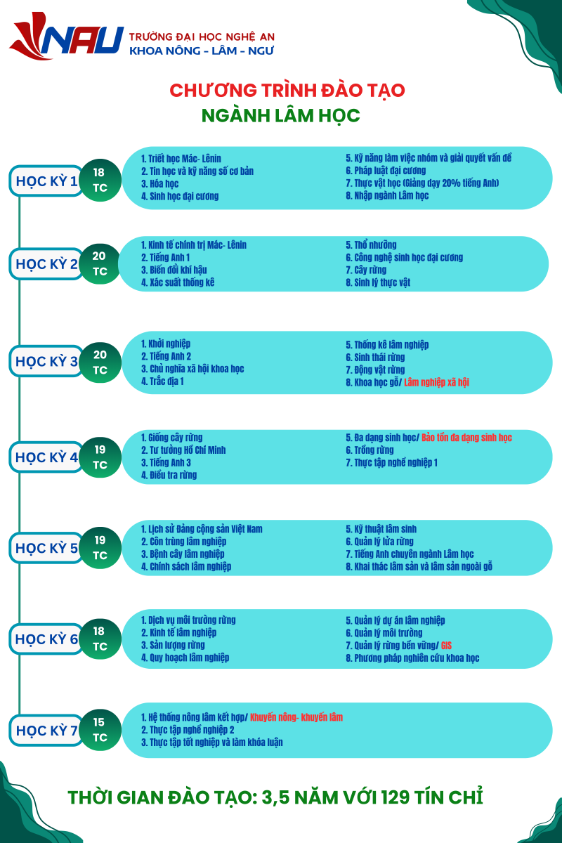 Chương trình đào tạo ngành Lâm học (Mã ngành: 7620201) được quản lý bởi Bộ môn Trồng trọt - Lâm sinh, thuộc khoa Nông Lâm Ngư, trường Đại học Nghệ An. Chương trình được thiết kế theo định hướng ứng dụng, phù hợp với chuẩn đầu ra theo Khung trình độ quốc gia Việt Nam, đáp ứng yêu cầu đổi mới giáo dục đại học và xu thế hội nhập quốc tế. Chương trình chính thức áp dụng từ năm 2025, trên cơ sở điều chỉnh và cập nhật từ chương trình năm 2022, theo học chế tín chỉ.