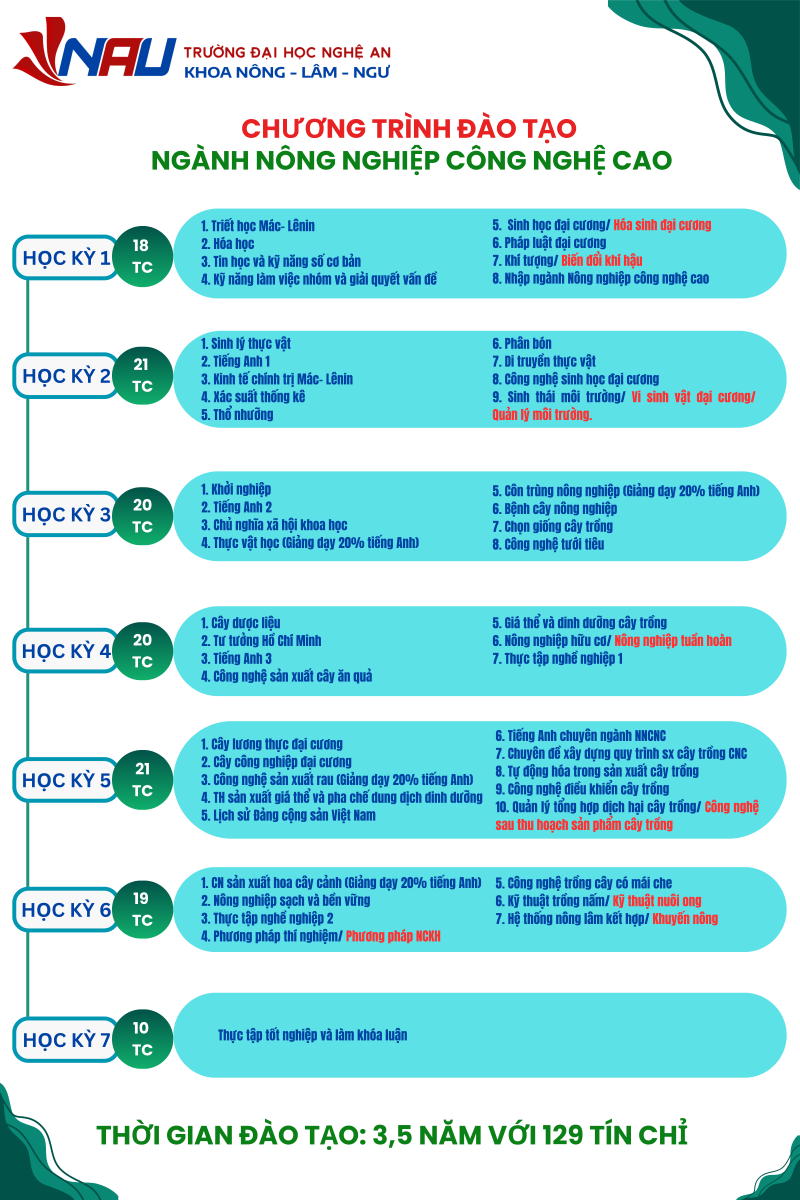 - Phát triển toàn diện kỹ năng nghề nghiệp: Sinh viên được rèn luyện kỹ năng chuyên môn, làm việc nhóm, nghiên cứu và khởi nghiệp trong lĩnh vực nông nghiệp công nghệ cao.