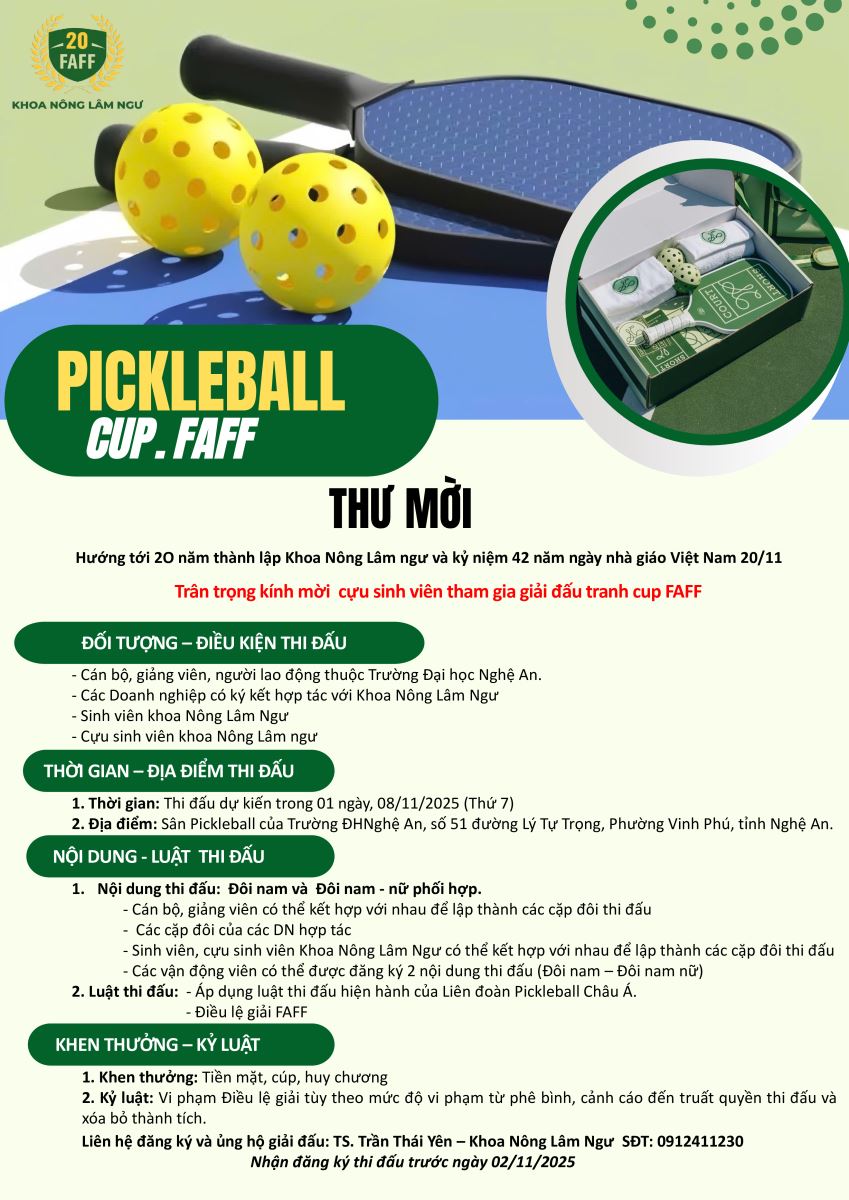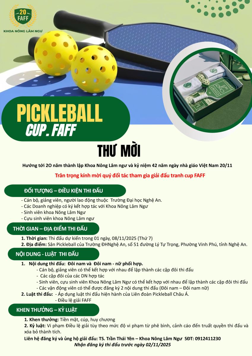Thư mời tham gia giải Pickleball chào mừng kỷ niệm 20 năm thành lập Khoa Nông Lâm Ngư 23/10/2025 10:23 1982 lượt xem