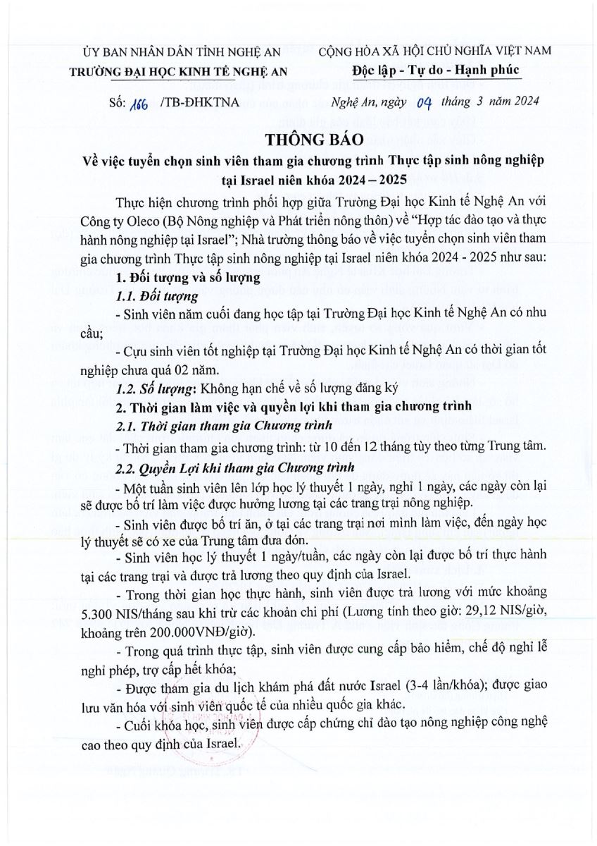 Thông báo tuyển chọn sinh viên tham gia chương trình Thực tập sinh nông nghiệp tại Israel niên khóa 2024- 2025 05/03/2024 10:21 6022 lượt xem
