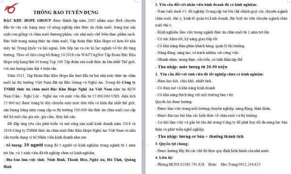 Thông báo tuyển dụng của công ty TNHH thức ăn chăn nuôi Đặc khu Hope Nghệ An 02/12/2018 10:57 9461 lượt xem