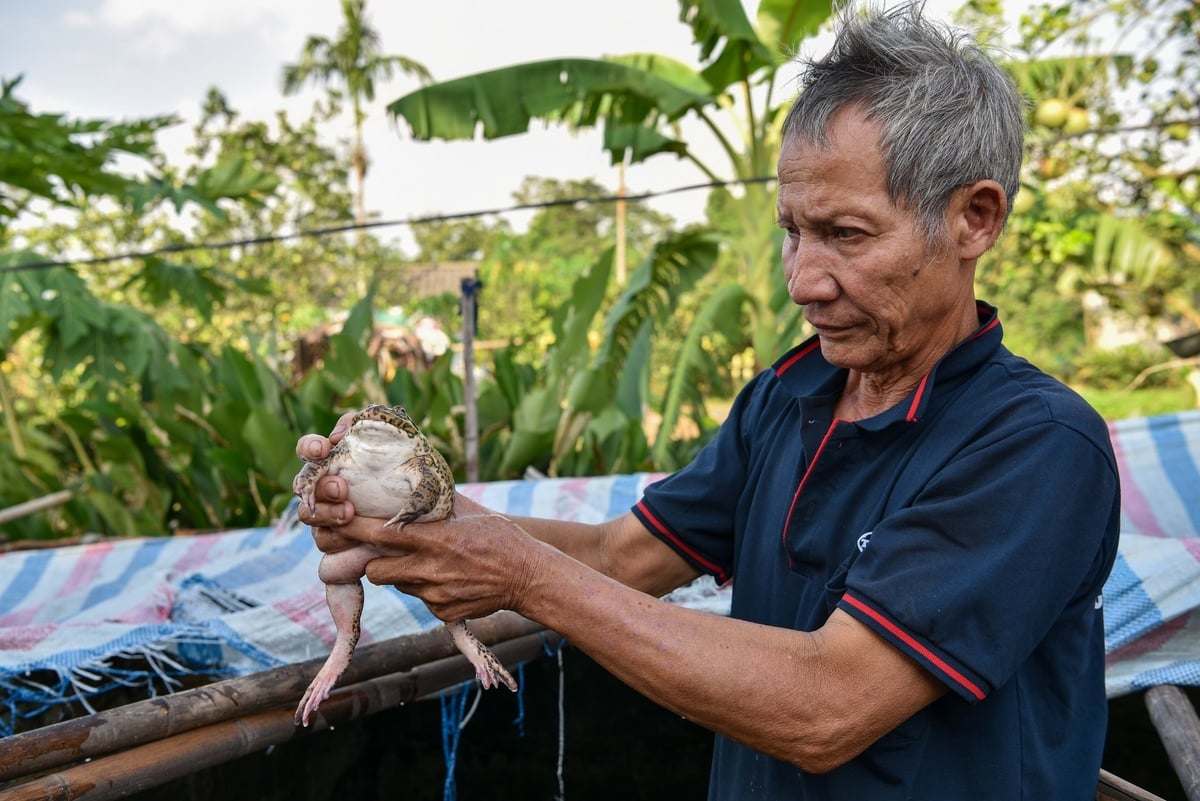 Ông Nguyễn Văn Khoa kiểm tra một con ếch cái giống.