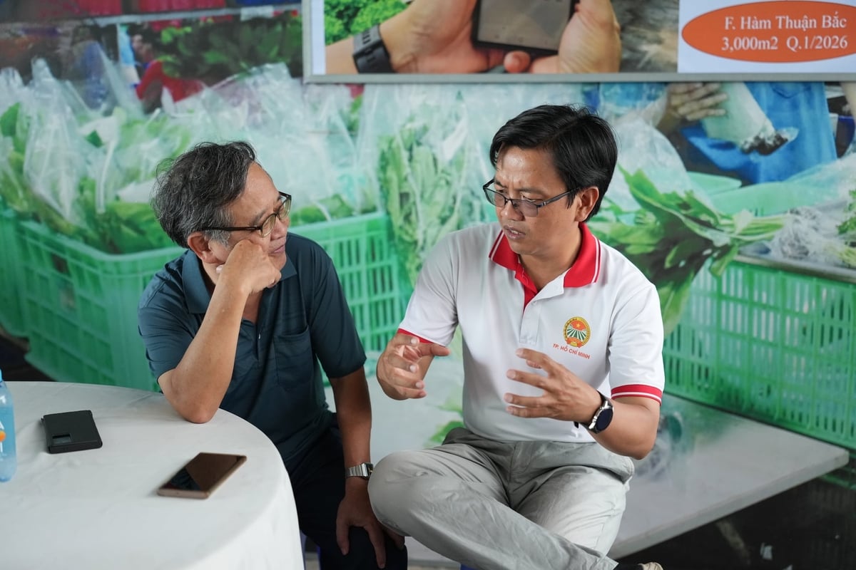 Chuyên gia nông nghiệp thăm và trò chuyện cùng anh Lâm Ngọc Tuấn, Chủ tịch HTX Rau thủy canh Tuấn Ngọc.