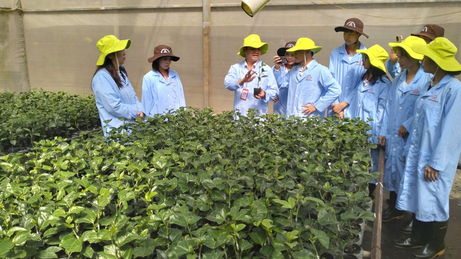 Sau chương trình làm việc tại nhà máy, đoàn tiếp tục tham quan các khu vực sản xuất giống và vùng trồng nguyên liệu của Nafoods. Sinh viên được tìm hiểu quy trình gieo hạt tạo cây gốc ghép, thăm nhà chăm sóc cây con, nhà trồng và chăm sóc cây đầu dòng – những khâu nền tảng quyết định chất lượng giống. Đặc biệt, đoàn được quan sát trực tiếp quy trình nhân giống bằng phương pháp ghép, kỹ thuật chăm sóc cây sau ghép và quy trình đóng thùng cây con để vận chuyển đến vùng sản xuất. Đây là những bước kỹ thuật quan trọng, đòi hỏi trình độ chuyên môn cao và là nội dung cốt lõi trong đào tạo ngành Nông nghiệp công nghệ cao.