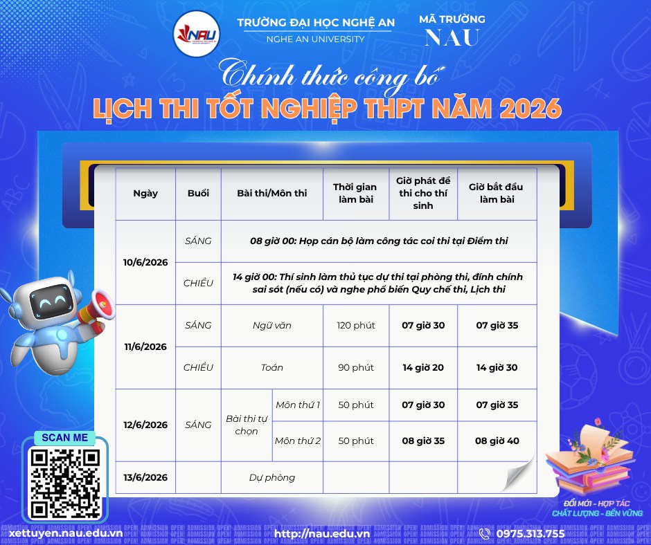 Ngày 19/3/2026, Bộ Giáo dục và Đào tạo đã chính thức công bố lịch thi tốt nghiệp trung học phổ thông (THPT) năm 2026. Trường Đại học Nghệ An thông tin đến học sinh và thí sinh một số nội dung quan trọng.
