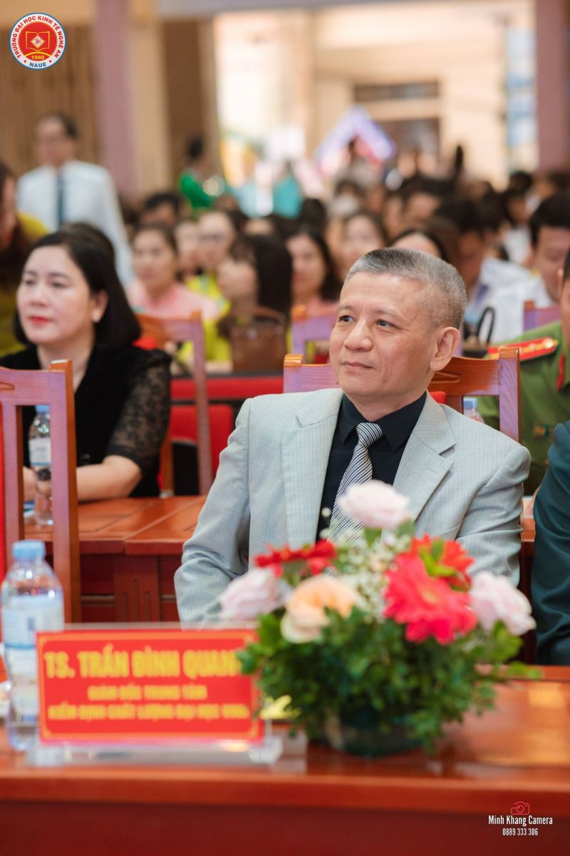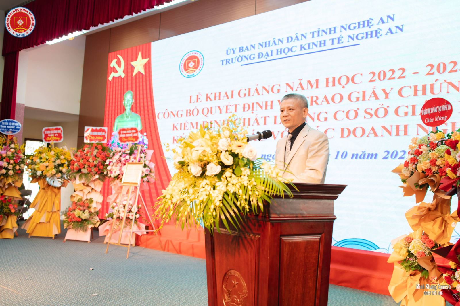 Tại buổi lễ, đại diện Hội đồng Kiểm định chất lượng giáo dục, TS. Trần Đình Quang - Giám đốc Trung tâm Kiểm định chất lượng giáo dục trường Đại học Vinh phát biểu chúc mừng và cảm ơn Trường Đại học Kinh tế Nghệ An, các cơ quan, đơn vị và các bên liên quan đã quan tâm, phối hợp, hợp tác có hiệu quả trong hoạt động đánh giá ngoài nói riêng cũng như các hoạt động kiểm định chất lượng giáo dục nói chung thời gian qua. Đánh giá cao các nỗ lực và các thành tựu của Nhà trường, TS. Trần Đình Quang cũng nhấn mạnh: Kiểm định chất lượng là một cơ chế quan trọng để đảm bảo chất lượng giáo dục, giúp các nhà trường có giải pháp cụ thể để cải tiến, nâng cao chất lượng quản trị, điều hành, đảm bảo chất lượng các hoạt động đào tạo, nghiên cứu khoa học và phục vụ cộng đồng; chứng nhận kiểm định chất lượng giáo dục là động lực và cũng là thách thức để tập thể lãnh đạo, cán bộ giảng viên, nhân viên và người học của Trường Đại học Kinh tế Nghệ An tiếp tục nỗ lực để giữ vững và nâng cao hơn nữa chất lượng, uy tín và thương hiệu của Nhà trường, đồng thời bày tỏ hy vọng Trường tiếp tục có các bước phát triển mới, khẳng định uy tín trên cơ sở tiếp tục triển khai tốt các hoạt động theo khuyến nghị của Đoàn Chuyên gia đánh giá ngoài và của Hội đồng Kiểm định chất lượng giáo dục.