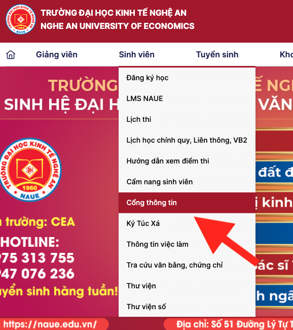 - Đưa chuột đến menu Sinh viên >> bấm vào mục Cổng thông tin.