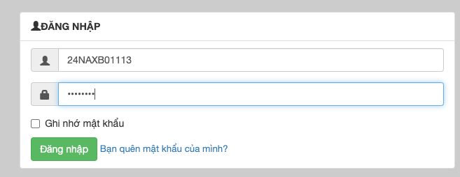Ví dụ sinh viên Nguyễn Hải Đăng có mã sinh viên 24NAXB01113 và ngày tháng năm sinh 20/11/1992 thì nhập đăng nhập vào như sau: