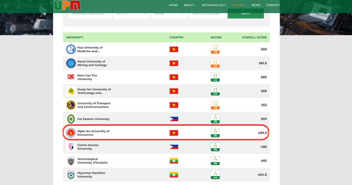 Theo đó, Trường Đại học Kinh tế Nghệ An đã đạt được kết quả tổng thể ở mức 3 sao PLUS theo định hướng ứng dụng. Trong đó, 5/8 lĩnh vực: Định hướng chiến lược; Nghiên cứu khoa học; Khuôn viên đại học; Quốc tế hóa và Phục vụ cộng đồng cùng đạt 4 sao.