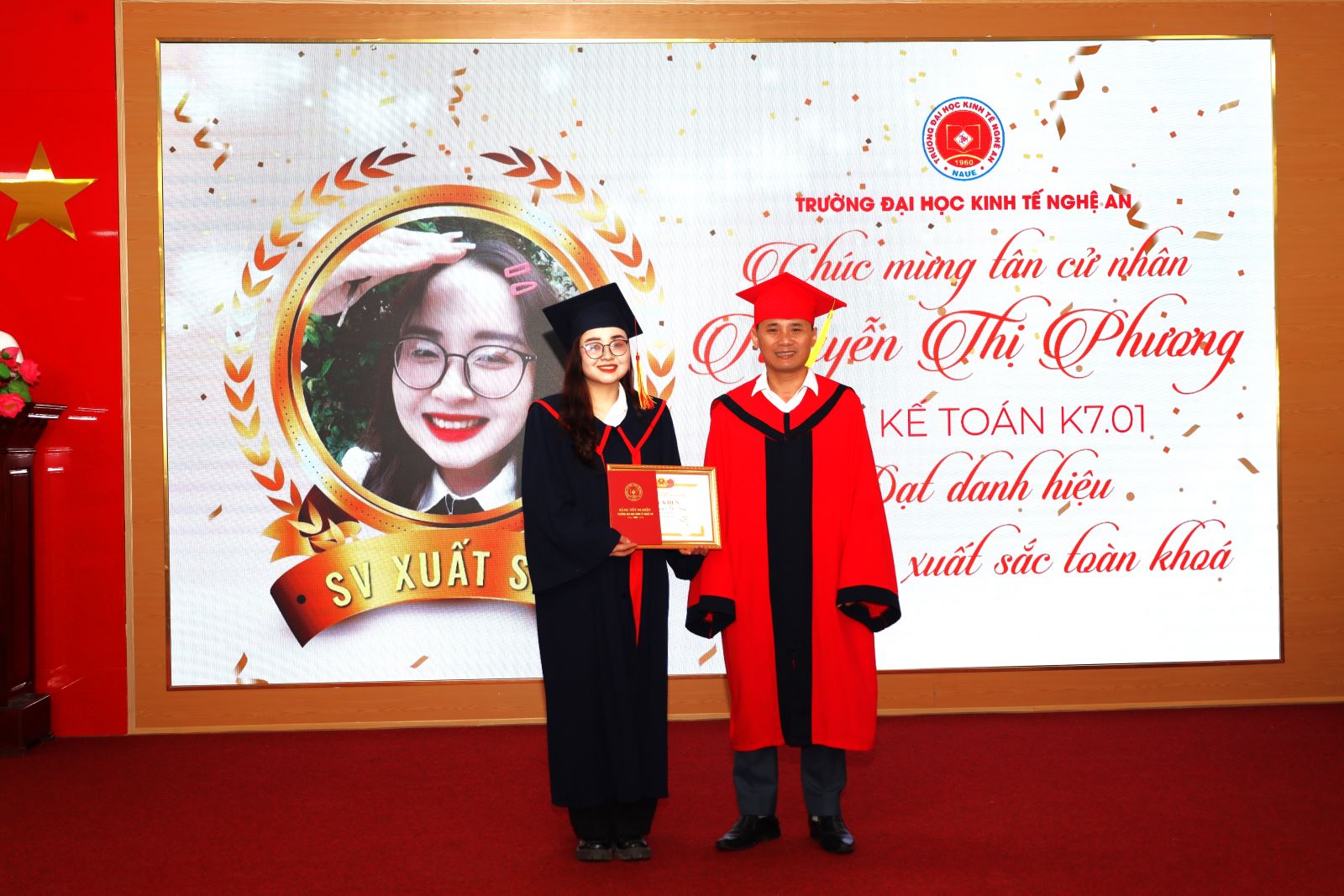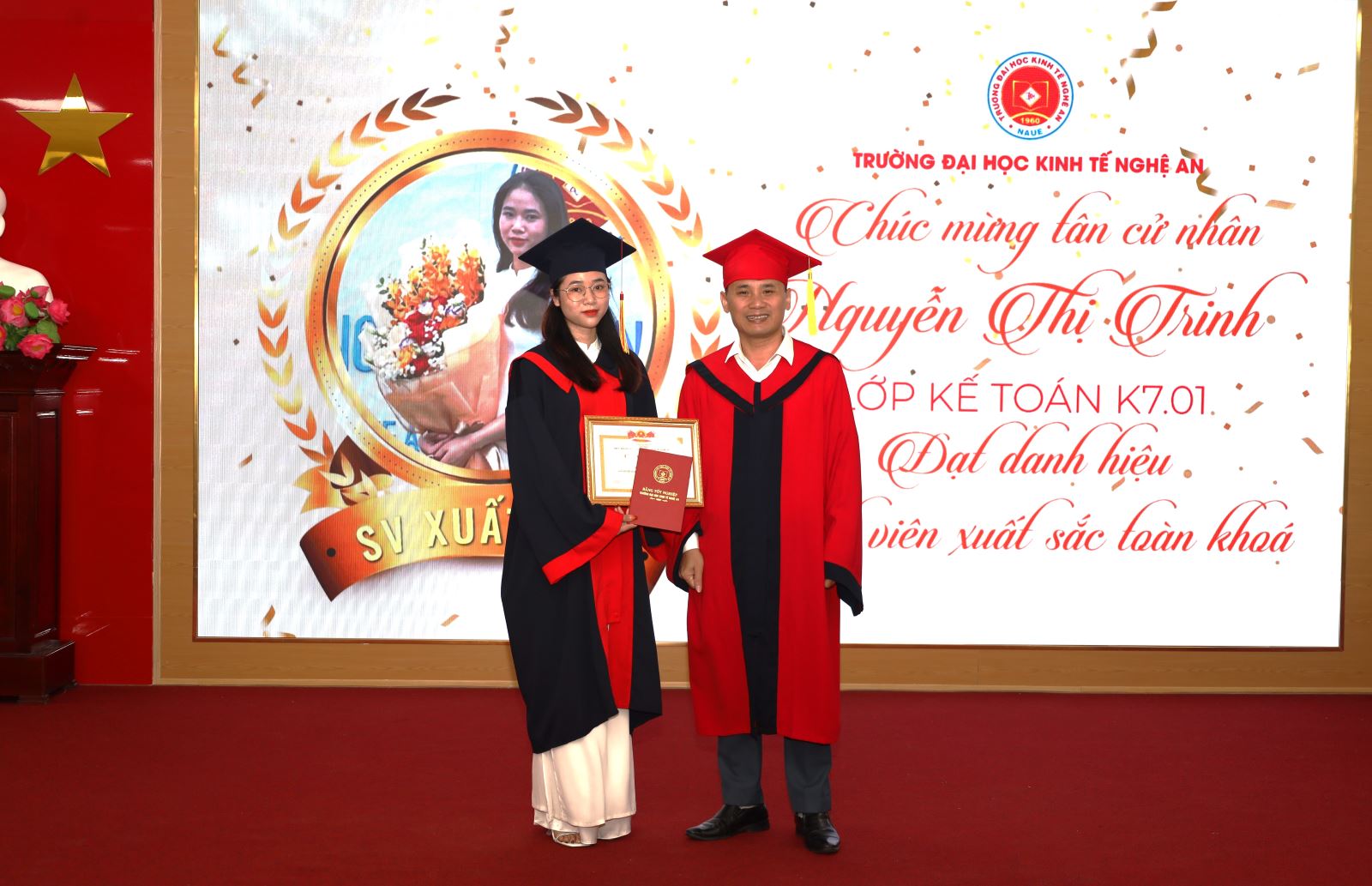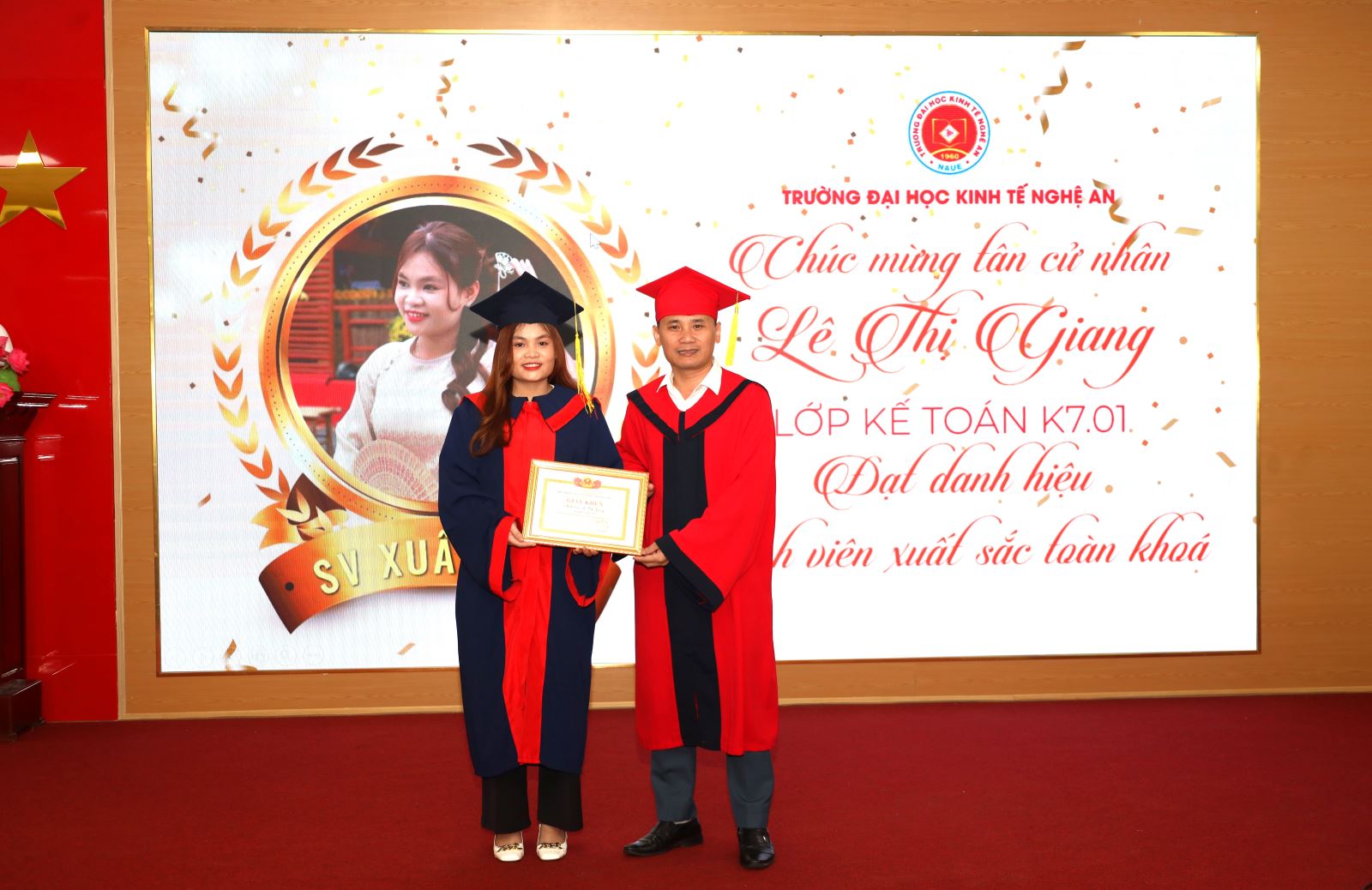 TS. Trương Quang Ngân - Phó Hiệu trưởng trao tấm bằng cử nhân và giấy khen cho sinh viên đạt danh hiệu “sinh viên xuất sắc toàn khóa”