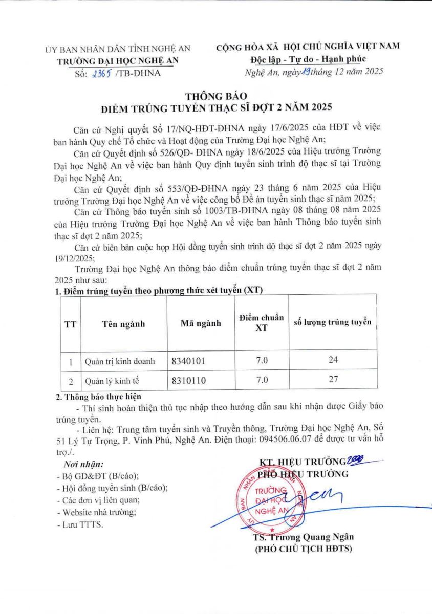 Thông báo điểm trúng tuyển Thạc sĩ đợt 2 năm 2025 19/12/2025 10:16 253 lượt xem Trường Đại học Nghệ An thông báo điểm trúng tuyển Thạc sĩ đợt 2 năm 2025