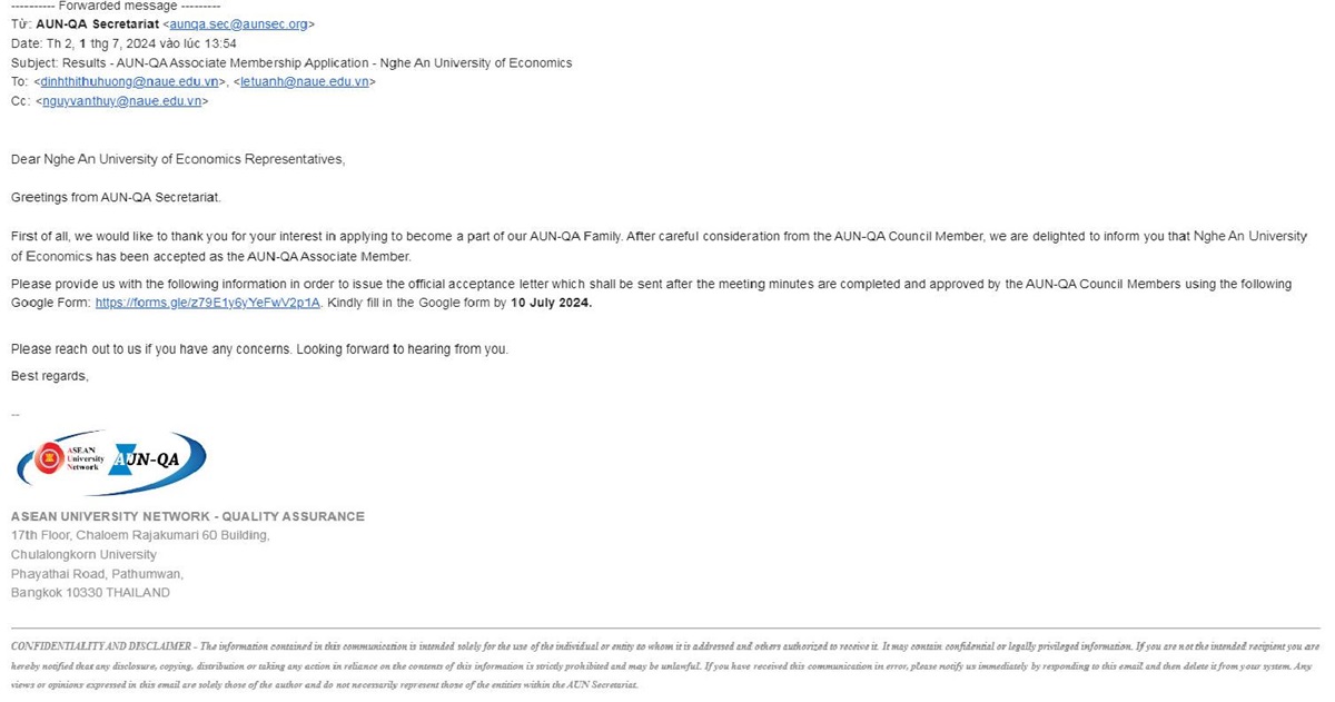 Thư chúc mừng từ Tổ chức AUN-QA xác nhận Trường Đại học Kinh tế Nghệ An trở thành thành viên AUN-QA